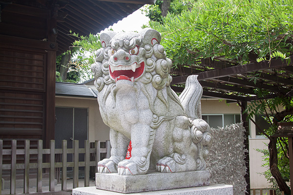 明治の終わり、日露戦捷記念で建てられた狛犬です。砲弾を抱えています。